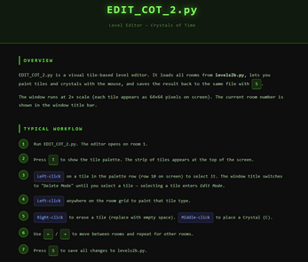 Once you saved, the data are into the levels2.py that will be loaded in the game, so you do not have to do anything else. If you want to preserve a set of rooms, you should change the name of them. I am thinking to make more maps, so that when you finish a level with some rooms, you can go to another level with different rooms and graphic. Stay tuned.